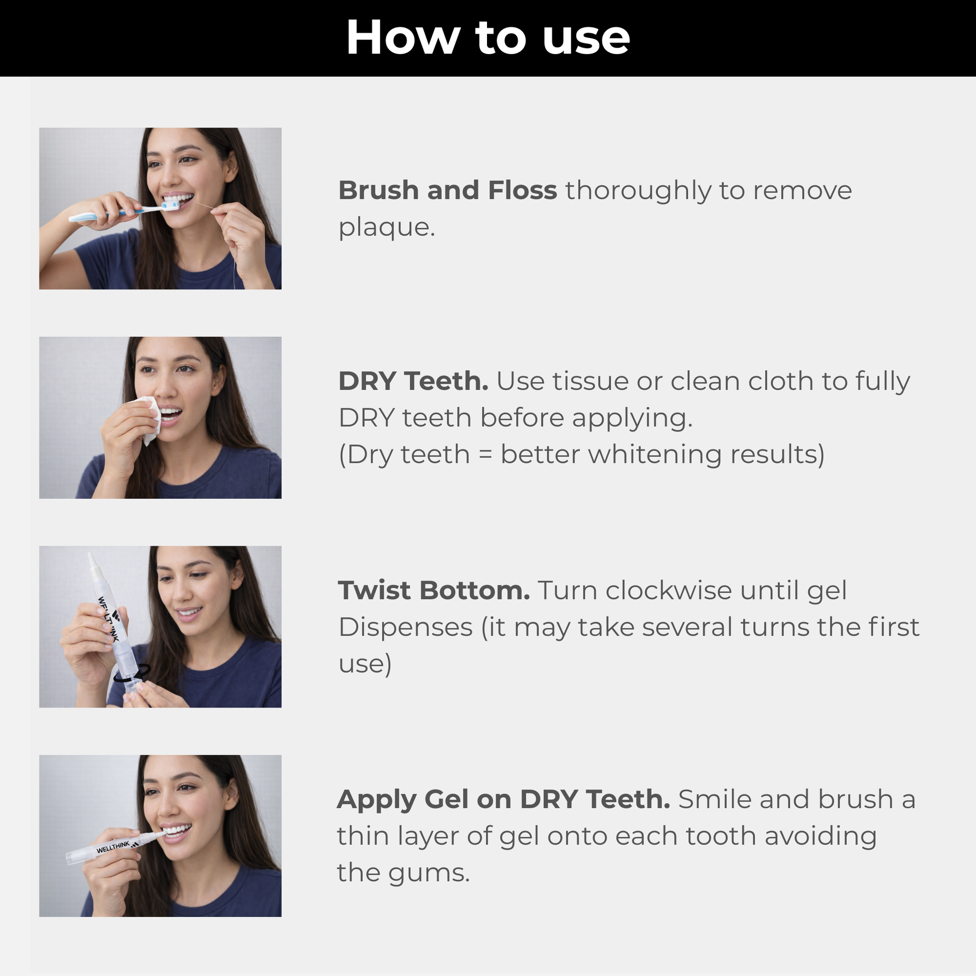 Transform your smile with the WELLTHINK Professional Teeth Whitening Pen. This innovative dental care solution features a transparent gel applicator and convenient twist dispenser mechanism for precise application. The easy-to-follow 6-step process ensures optimal results: begin by brushing and drying your teeth, twist the pen to dispense the whitening gel, apply it evenly with a smile, rinse with water, and avoid eating or drinking for 30 minutes afterwards. The pen's sleek design makes it perfect for touch-ups anywhere, anytime. Formulated with advanced ingredients including Potassium Nitrate and Hydroxyapatite, this whitening treatment is designed to help enhance your smile. The transparent gel allows you to see exactly where you're applying the product, ensuring even coverage. Please note: not suitable for users under 16, those with over-sensitive teeth, decaying/loose teeth, or during pregnancy/lactation. Each package includes one whitening pen with model code TW101
